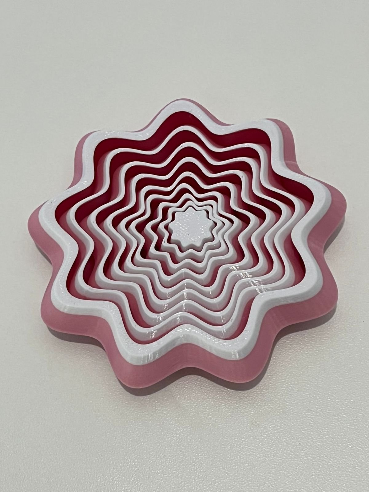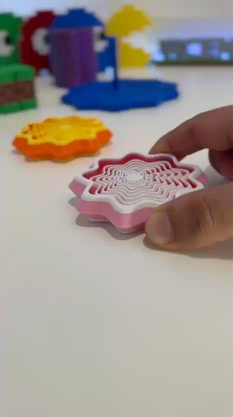 Seu formato em estrela abriga múltiplas camadas que se movimentam de forma contínua e controlada. Ao puxar e pressionar, as partes internas se expandem e retornam, criando um ciclo infinito de movimento — sempre com um limite inteligente que impede que as peças se soltem.